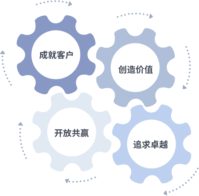 成就客户是一切决策的出发点,,,创造价值是衡量所有工作的标准,,,,追求卓越是我们做事做人的态度,,,开放共赢是我们的格局也是最终的结果。。。。价值观的齿轮环环相扣,,,推动着组织里的每个人不断向前。。。