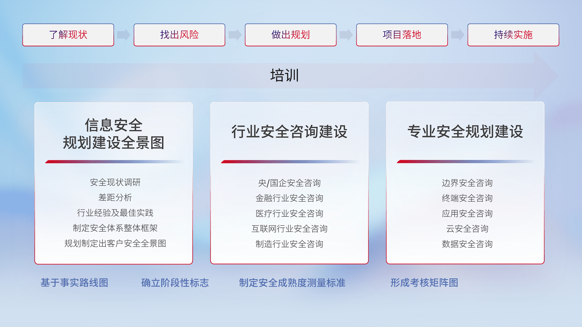 针对客户行业特性,,以专业的安全服务+多厂商联合解决方案提供专属的一站式安全管理服务,,帮助客户全面感知网络空间威胁,,,,基于识别、、、检测、、、、分析、、、、防护、、、、监测、、、响应的服务理论模型,,,从方案咨询、、、集成交付、、、、评估验证、、优化加固、、、运维运营,,致力于为客户提供完整的闭环管理式安全服务。。。以实战经验为客户打造高抵御风险的安全体系,,帮助客户发现威胁、、对抗威胁、、处置威胁,,,不断积累安全对抗能力,,,,持续保障数字化安全。。